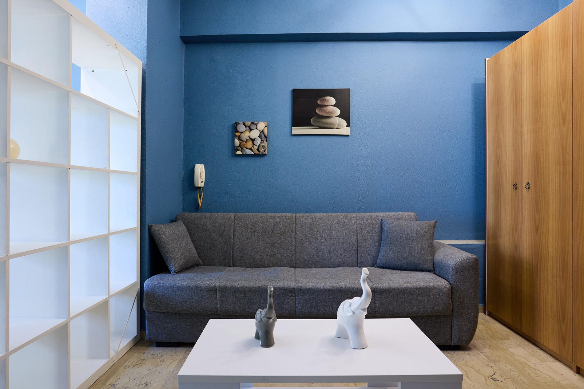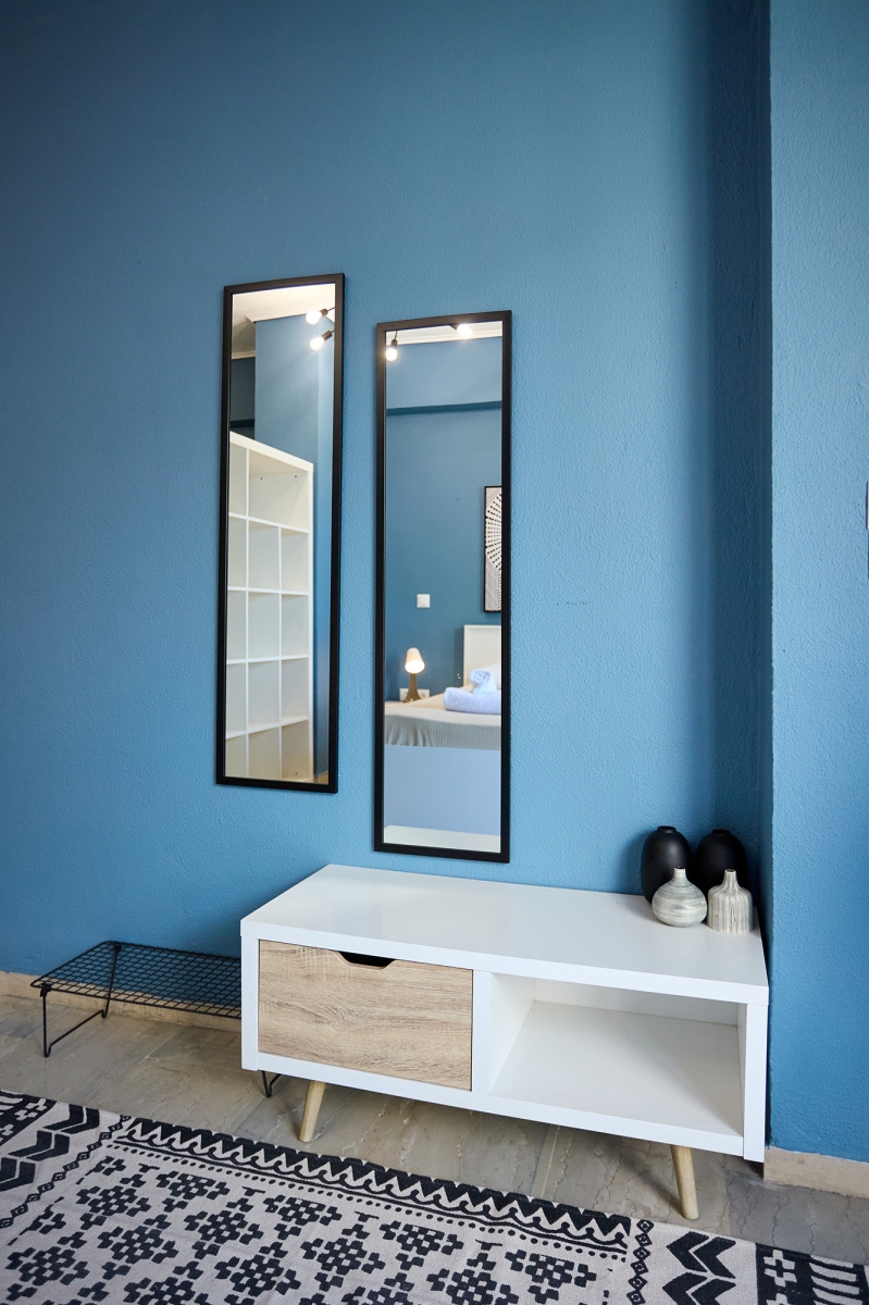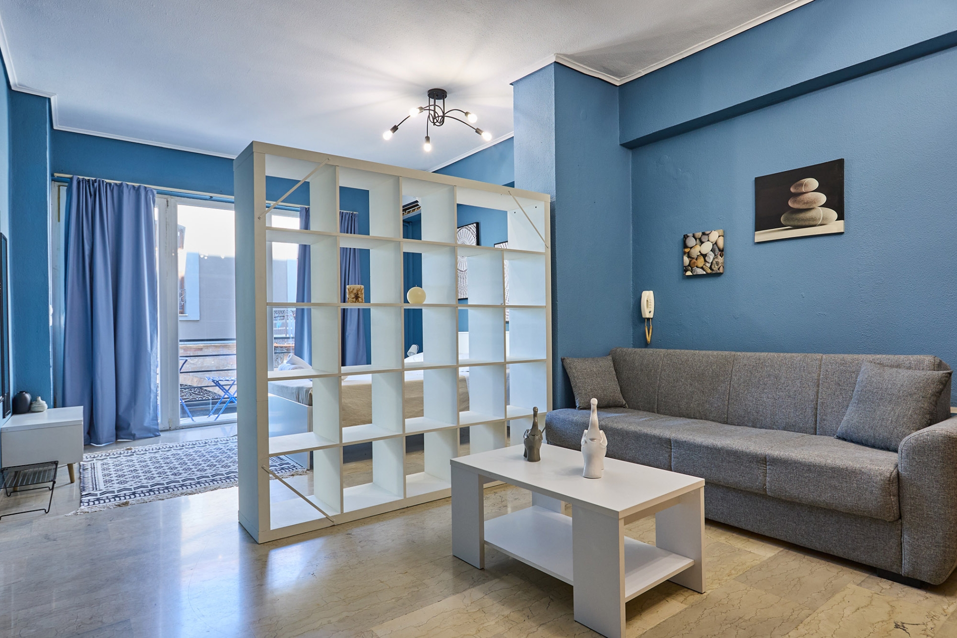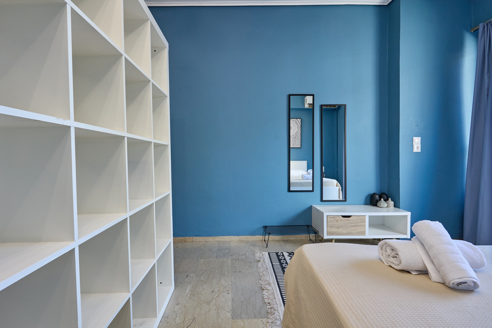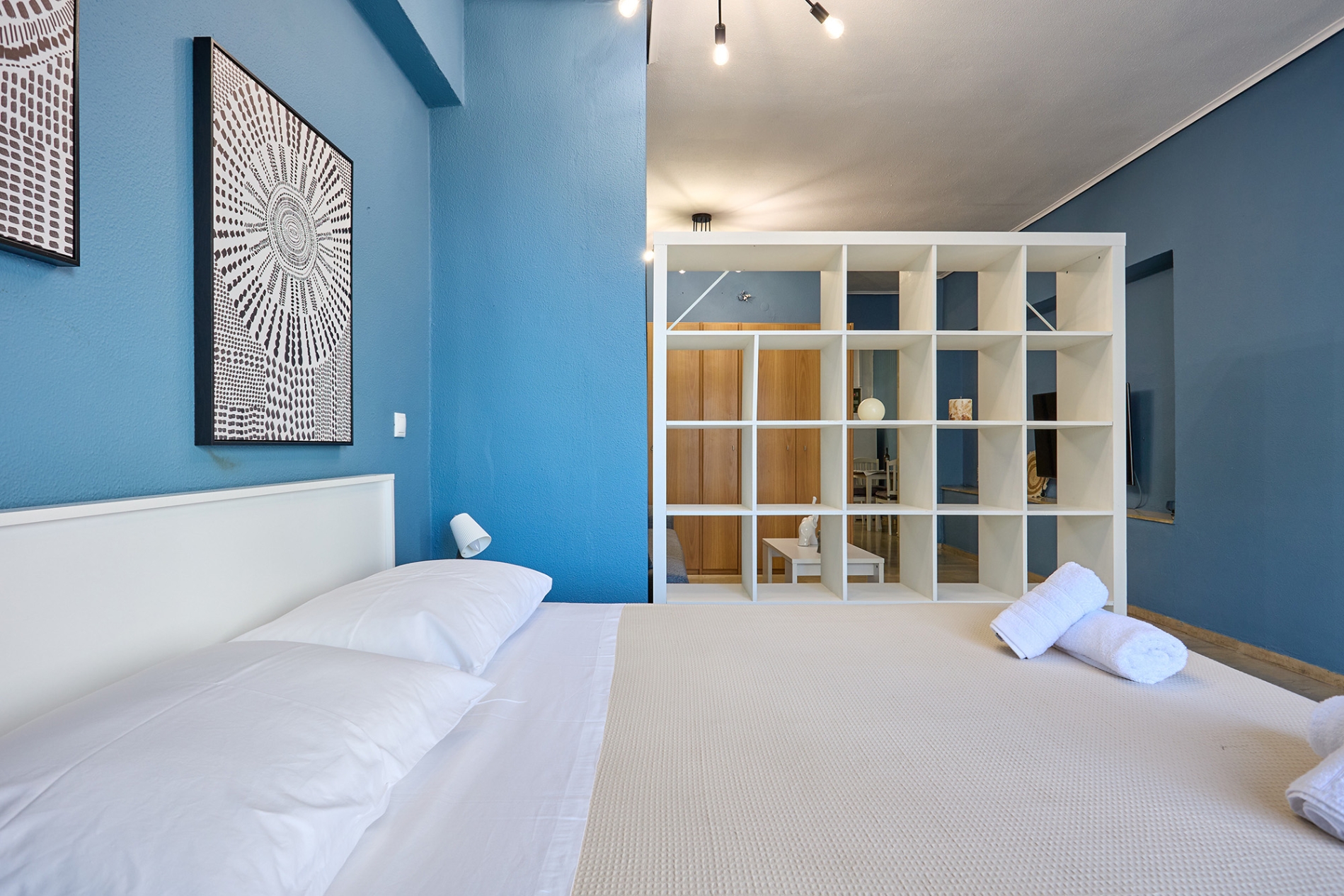 Το σύγχρονο αυτό διαμέρισμα 50 τ.μ. μπορεί να φιλοξενήσει έως τρεις επισκέπτες και διαθέτει ενιαία διαρρύθμιση με ένα άνετο κρεβάτι queen size και καθιστικό, χωρισμένα διακριτικά με μια βιβλιοθήκη για μεγαλύτερη ιδιωτικότητα. Ο καναπές μετατρέπεται εύκολα σε μονό κρεβάτι, ιδανικό για έναν επιπλέον επισκέπτη.