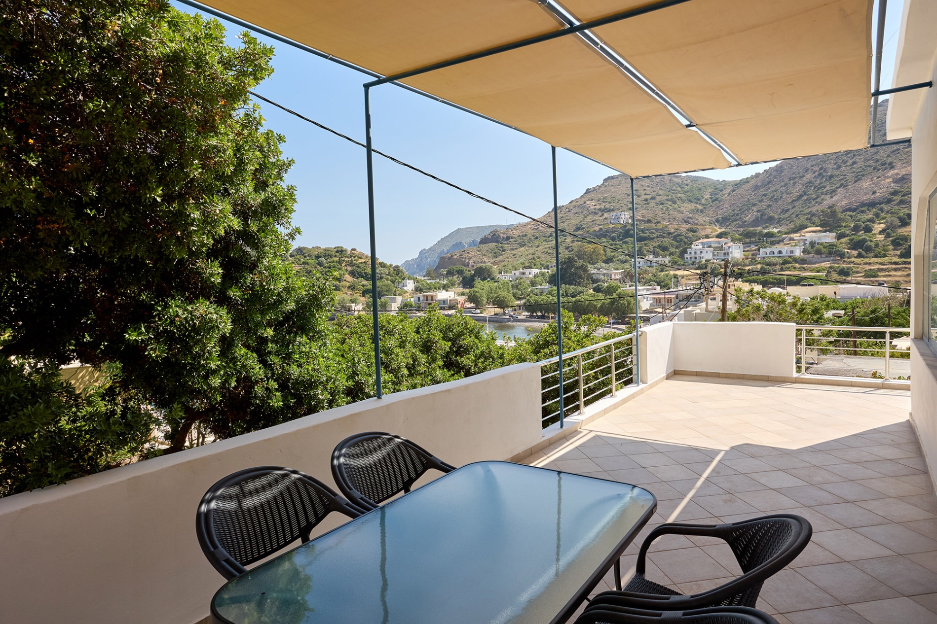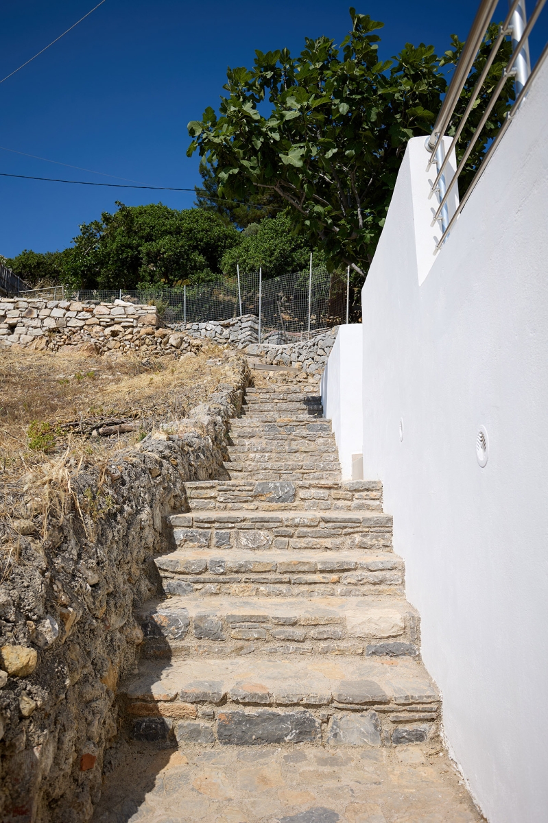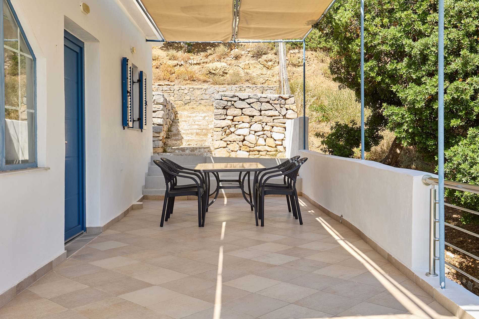 Στην ιδιωτική και μεγάλη βεράντα με την τραπεζαρία, οι επισκέπτες μπορούν να απολαύσουν την εκπληκτική θέα στο Αιγαίο Πέλαγος — το ιδανικό σημείο για να χαλαρώσουν και να απολαύσουν τη γαλήνη του Εμπορειού.