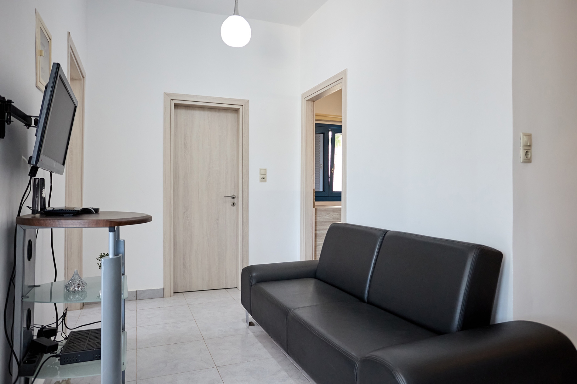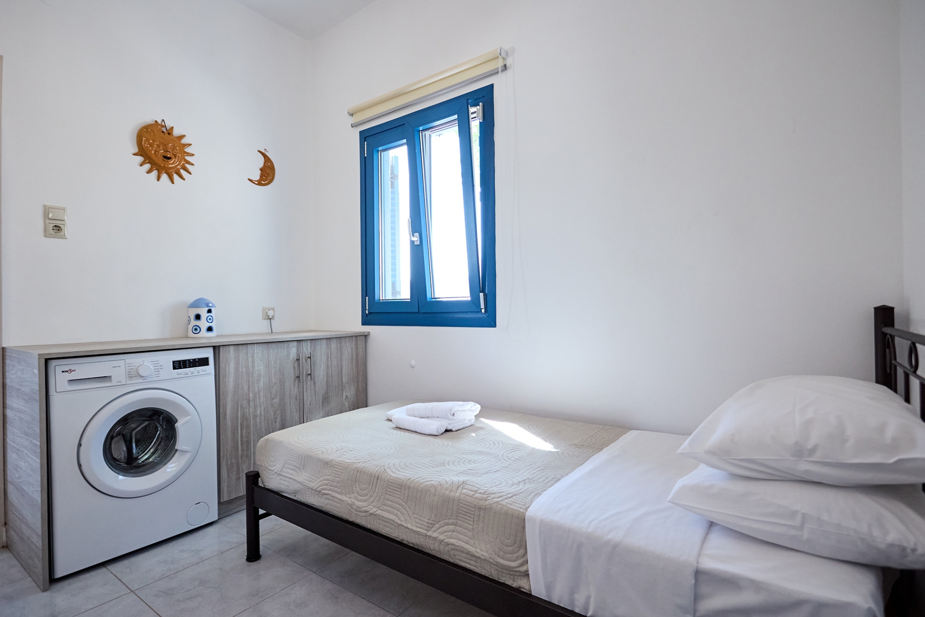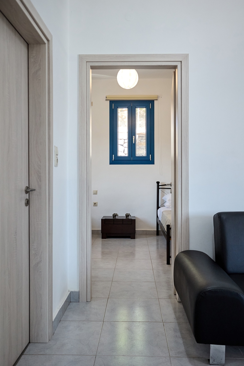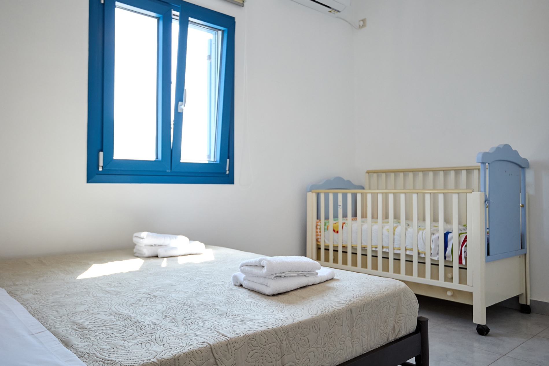 Το διαμέρισμα διαθέτει δύο υπνοδωμάτια — το ένα με κρεβάτι queen-size και παιδικό κρεβατάκι, και το δεύτερο με διπλό και μονό κρεβάτι — προσφέροντας άνεση και ευελιξία για κάθε τύπο διαμονής.