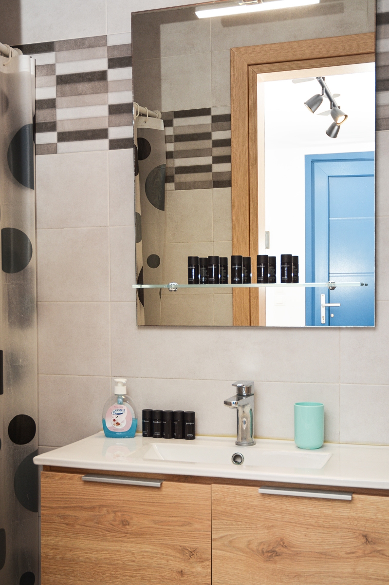 Το μοντέρνο μπάνιο περιλαμβάνει ντους ψιλής βροχής, προϊόντα περιποίησης και φρέσκες πετσέτες, ενώ από το κοινόχρηστο μπαλκόνι οι επισκέπτες μπορούν να απολαύσουν εκπληκτική θέα στη θάλασσα και μια γαλήνια ατμόσφαιρα.